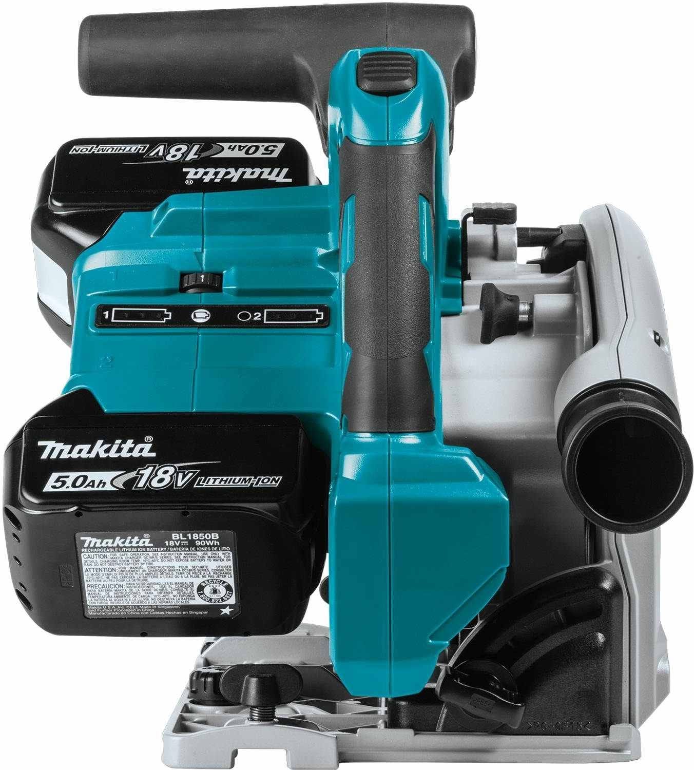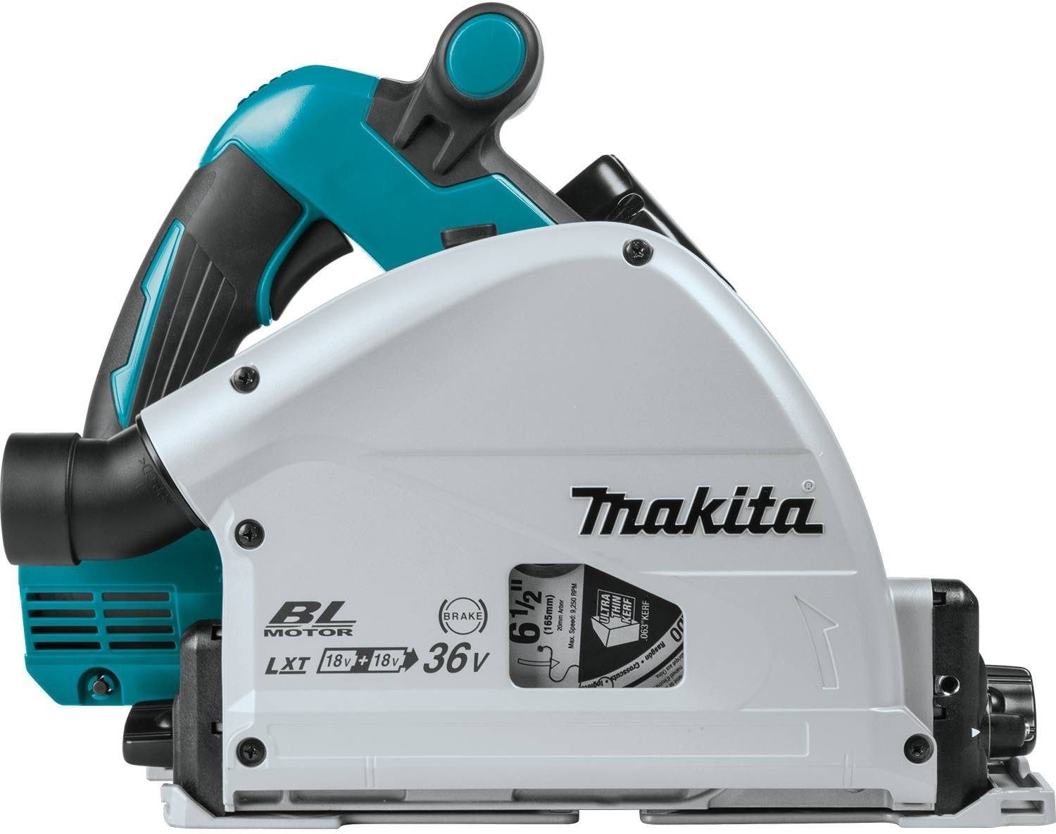 Makita XPS01PTJ Cordless Brushless 36V LXT 6-1/2″ Track Saw 5AH KitPrecise and AccurateThe Makita 18V X2 (36V) LXT Brushless 6-1/2” Plunge Circular Saw Kit (XPS01PTJ) delivers precise and more accurate cutting when combined with an optional guide rail system (sold separately). The saw and rail system work together to produce accurate cuts with minimal tear-out. The saw combines a powerful Makita-built brushless motor powered by two 18V LXT batteries with Automatic Speed Change Technology, which adjusts cutting speed and torque during the cut for optimum performance.On The Job or In a WorkshopThe Saw has a variable speed control dial (2,500 – 6,300 RPM), with soft start and an electric brake for added convenience. It has a large 2-3/16” cutting capacity at 90 degrees, with a bevel capability of -1° to 48° and positive stops at 22.5° and 45°. When used with a rail system (sold separately) the Plunge Circular Saw is a more portable option to a table saw for select applications, and is ideal for use on the job site or in a workshop.